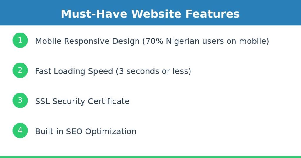 Over 70% of Nigerian web users access the internet primarily through mobile phones. If your website doesn’t work seamlessly on smartphones and tablets, you’re losing customers before they even see what you offer.
